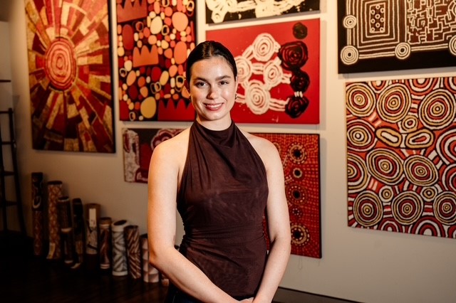 Arabella Walker is from a maternal line of Wulli Wulli, Auburn Hawkwood people. She is an early career contemporary Aboriginal artist. Walker’s practice conveys significant topics of First Nations histories with a focus on the challenge of being an Aboriginal woman living in the Colony. Walker deals with this challenge by weaving Indigenous ways of knowing and being into knowledges of culture and protocols, connections, and traditions, through a variety of media. The body is activated to express ideas, cultural knowledge, histories, stories and cultural connections. Media, such as acrylic paints, video projections, and installations form an interdisciplinary dialogue. Walkers creative process communicates a cultural intent in ways that words can not.